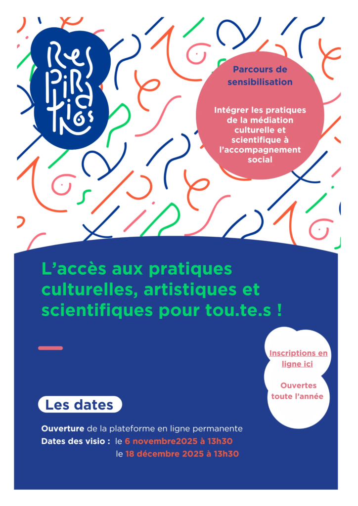 Cultures du Cœur, Les Petits Débrouillards et la Fédération co-porteurs du programme Respirations vous propose le parcours de sensibilisation « Intégrer les pratiques culturelles et scientifiques à l’accompagnement social », en ligne, ouvert aux intervenant.e.s sociaux.ales et à toute personne intéressée par le programme